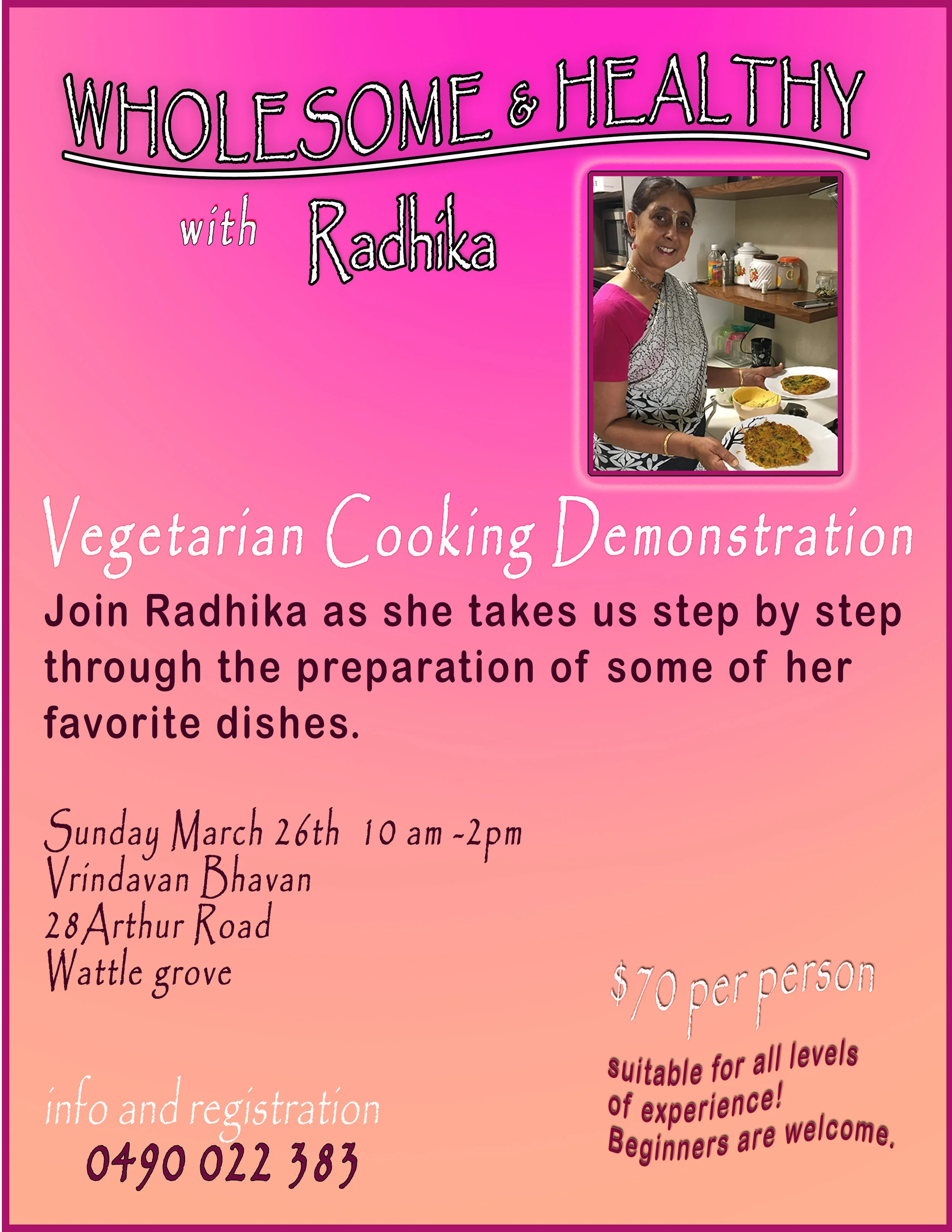 Radhika Dasi is an accomplished vegetarian chef with many years of experience all over the globe. She returns to Perth this March demonstrating her amazing repertoire of vegetarian cuisine. Here's a glimpse of the planned menu-
