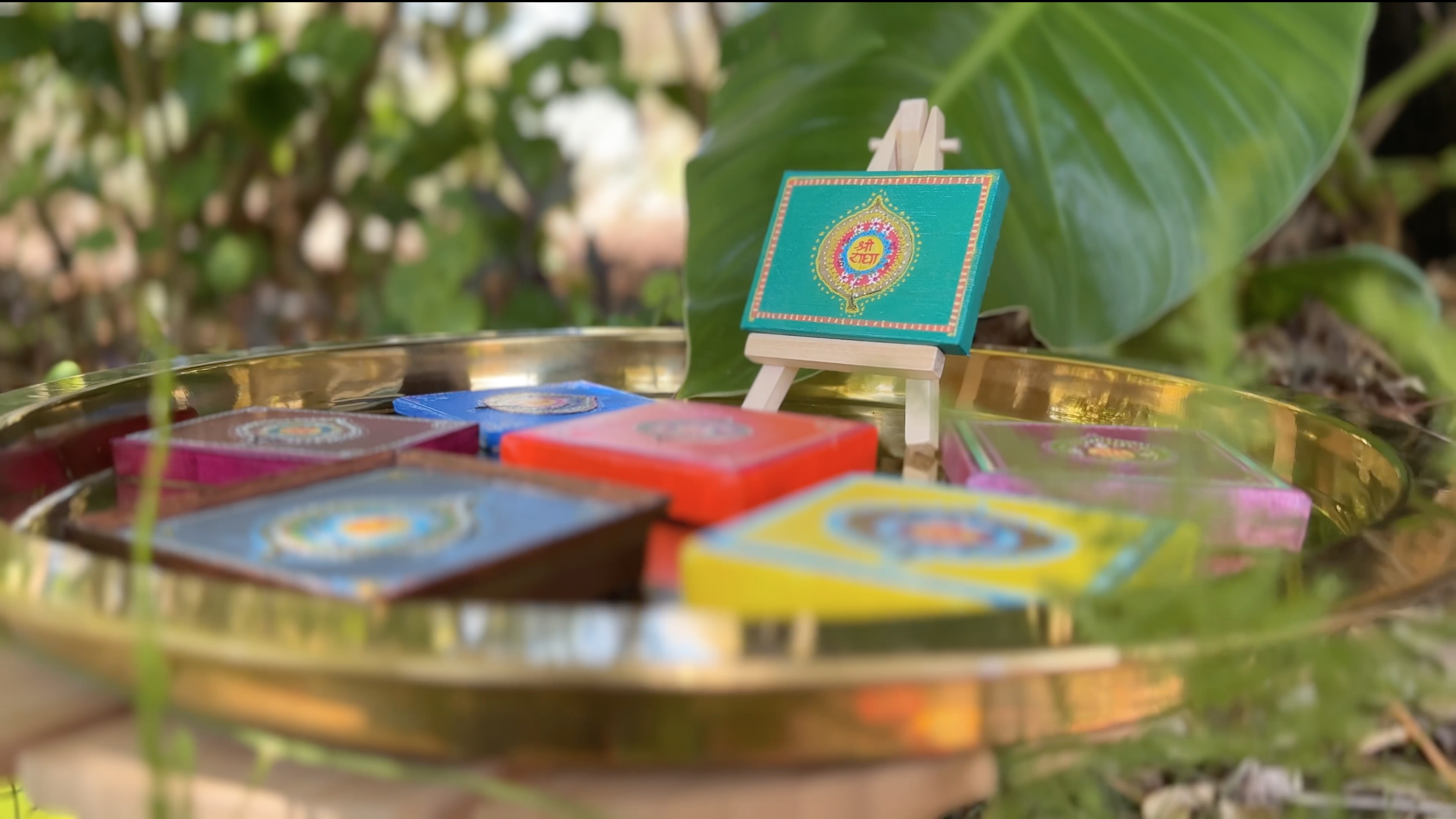 I was inspired to decorate each leaf with the iconic “password” for Vrindavan, the sacred name of “Sri Radha”. Each leaf has become an inner portal to the mystical interior of this magical place.”